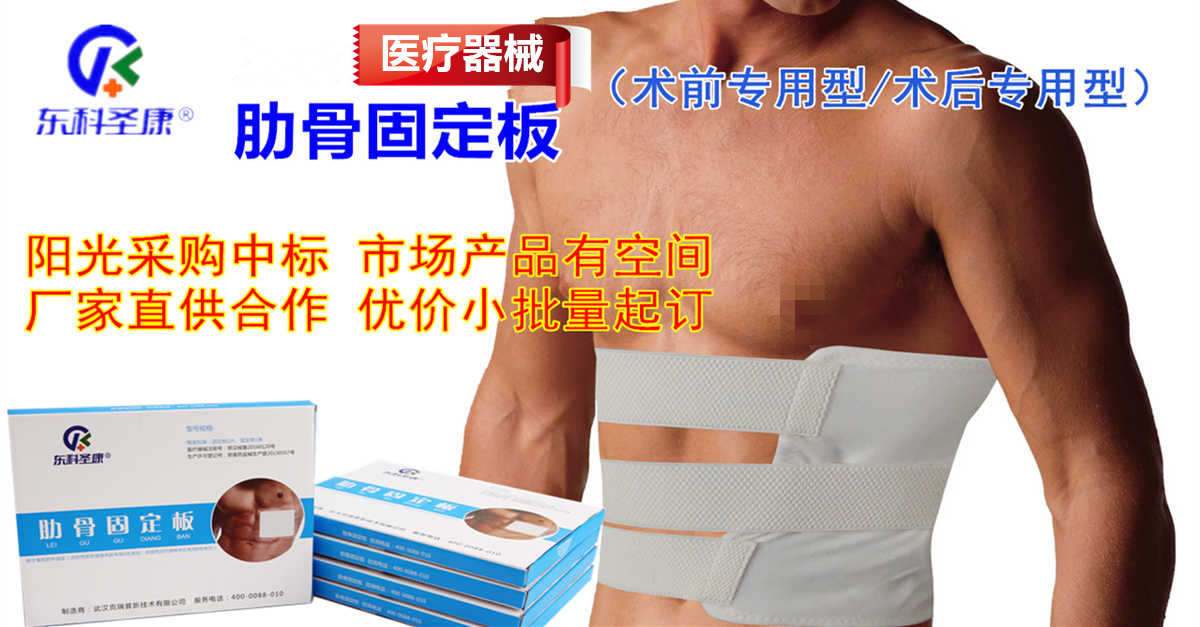 東科圣康品牌肋骨固定板(胸骨固定板)系列產(chǎn)品,分為術(shù)前A型、術(shù)后B型兩大類,生產(chǎn)廠家武漢克瑞普直接供貨合作,產(chǎn)品由醫(yī)用高分子材料、記憶金屬鋁合金板、多頭胸背部肋骨固定帶等組成,具有多層結(jié)構(gòu),重量輕,體驗度好,使用前無需加熱,操作簡單方便(有產(chǎn)品操作使用視頻)等特點,可用于開放性、閉合性肋骨骨折、胸背部/胸側(cè)壁肋骨損傷,以及胸部軟組織挫傷的外固定,產(chǎn)品用手依身體患部曲線塑形,與身體的合體性較好,固定剛性符合臨床要求;產(chǎn)品表面采用低敏性材料,具有透氣性和防水性,使用期間可沐浴,可拍X光復(fù)檢。